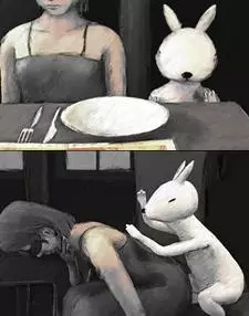 Tetsuji Kurashige's nightmarish U-SA-GUI (2002) begins by citing a section from Brillat-Savarin's 1825 treatise, The Physiology of Taste, in which the renowned French epicure suggests that stimulating foods, meats in particular, can have an influence on one's dreams. The film depicts a macabre game played by two rabbits and a blindfolded woman. The rabbits face each other over an old-fashioned illustrated board game. When they land on a square, the woman must eat the food indicated in the illustration. If she has chosen correctly, a die pops out of her mouth and lands on the floor giving the rabbits their next move. (Source: Midnight Eye)